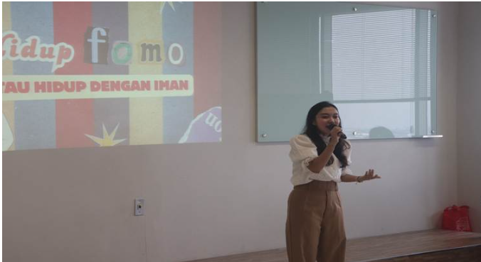 Kegiatan dilanjutkan dengan sesi pembicara yang membawakan materi mengenai fenomena Fear of Missing Out (FOMO) yang kerap dialami anak muda masa kini. Dalam sesinya, Kak Viona mengajak peserta untuk mengenali bagaimana rasa takut tertinggal dapat memengaruhi kesejahteraan mental dan spiritual, serta bagaimana Faith Over Missing Out” dapat menjadi kunci untuk menjalani hidup dengan rasa cukup dan damai dalam iman.