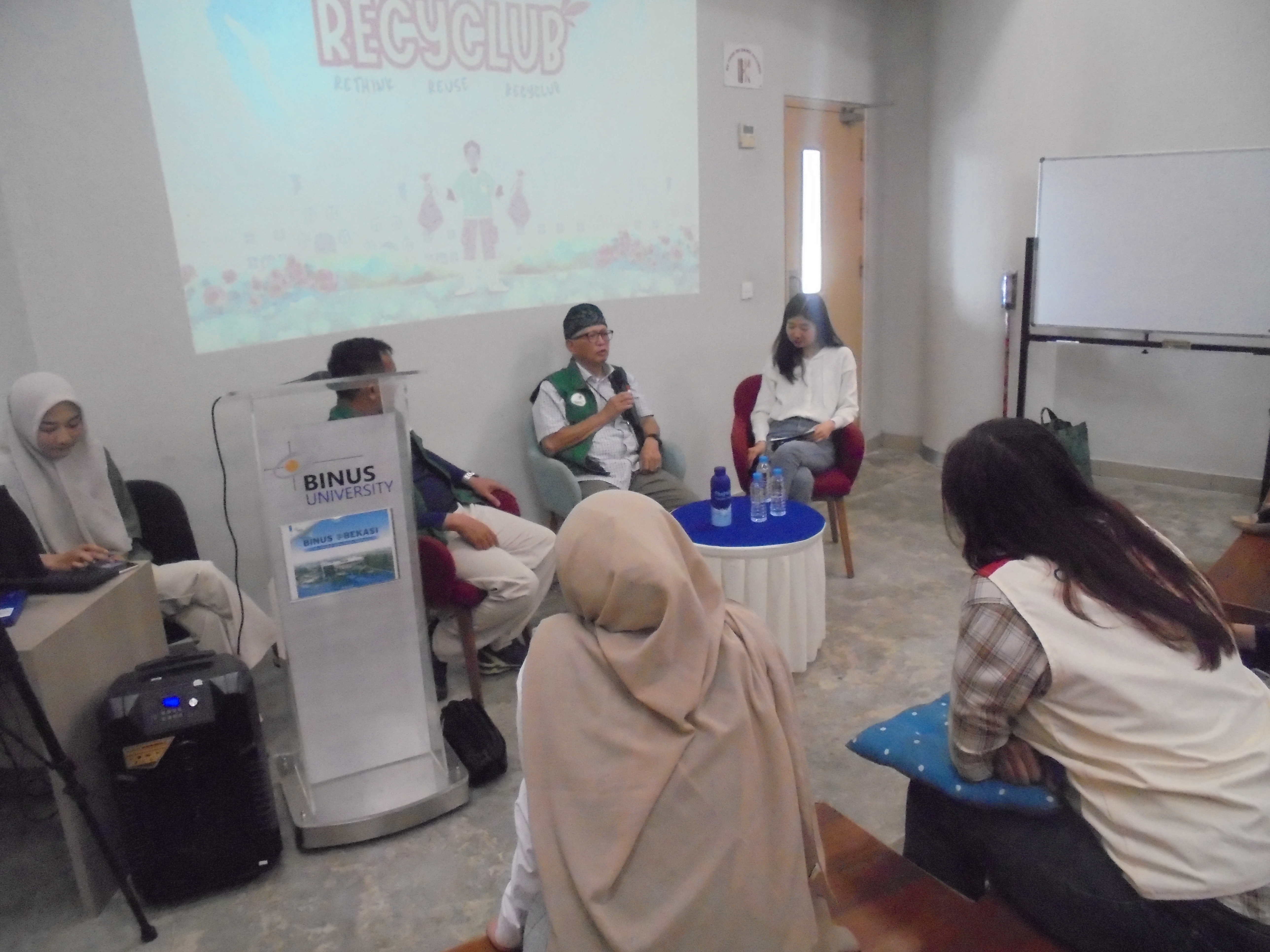 Program dimulai dengan kegiatan talkshow edukatif pada hari pertama, Jumat 26 September 2025, yang diselenggarakan di Ruang 413, BINUS @Bekasi. Acara dibuka dengan meriah oleh MC yang menyambut para peserta dengan penuh antusias. PIC dan Project Manager Recyclub 2025 menyampaikan sambutan pembukaan yang menjelaskan tujuan dan pentingnya program ini dalam upaya menjaga kelestarian lingkungan.